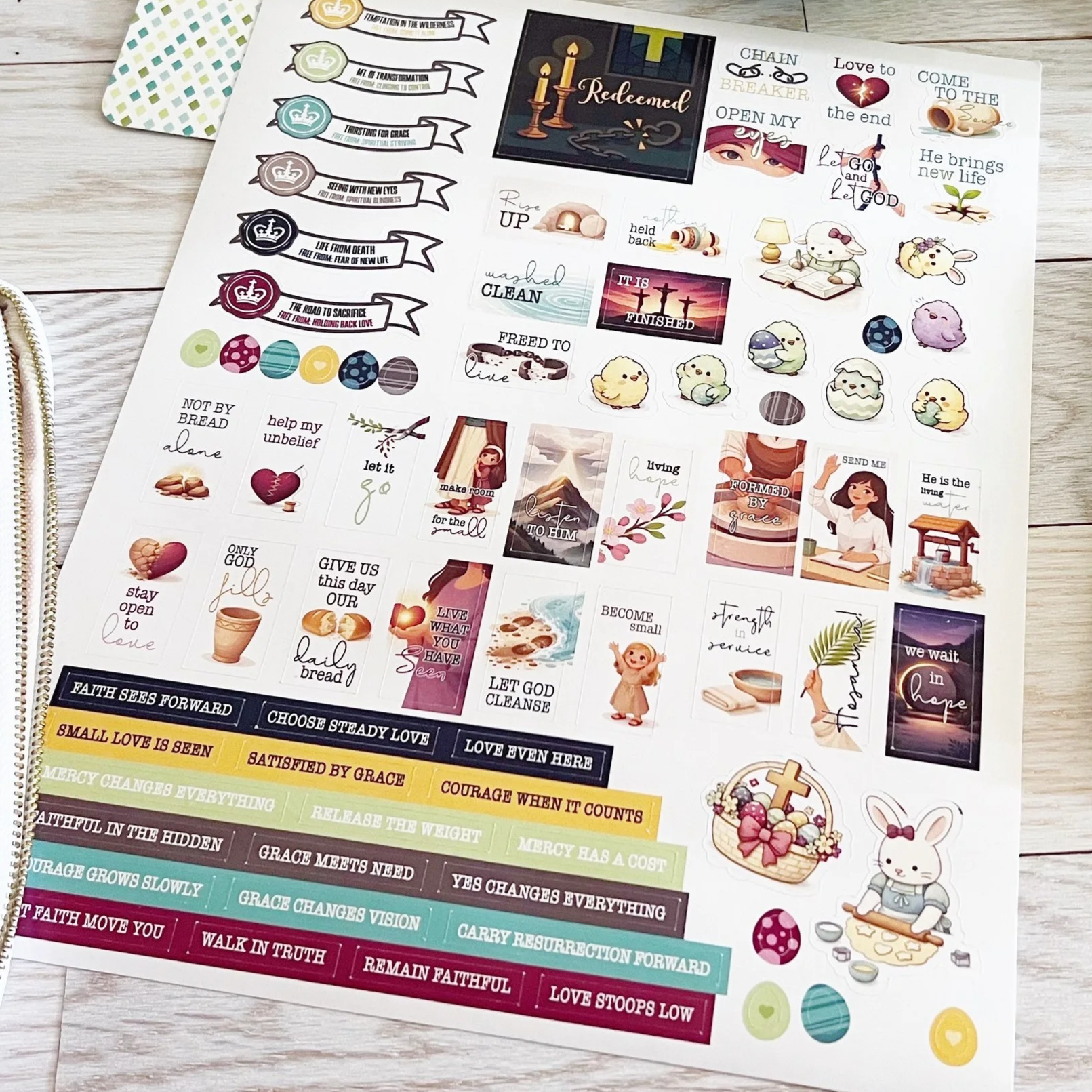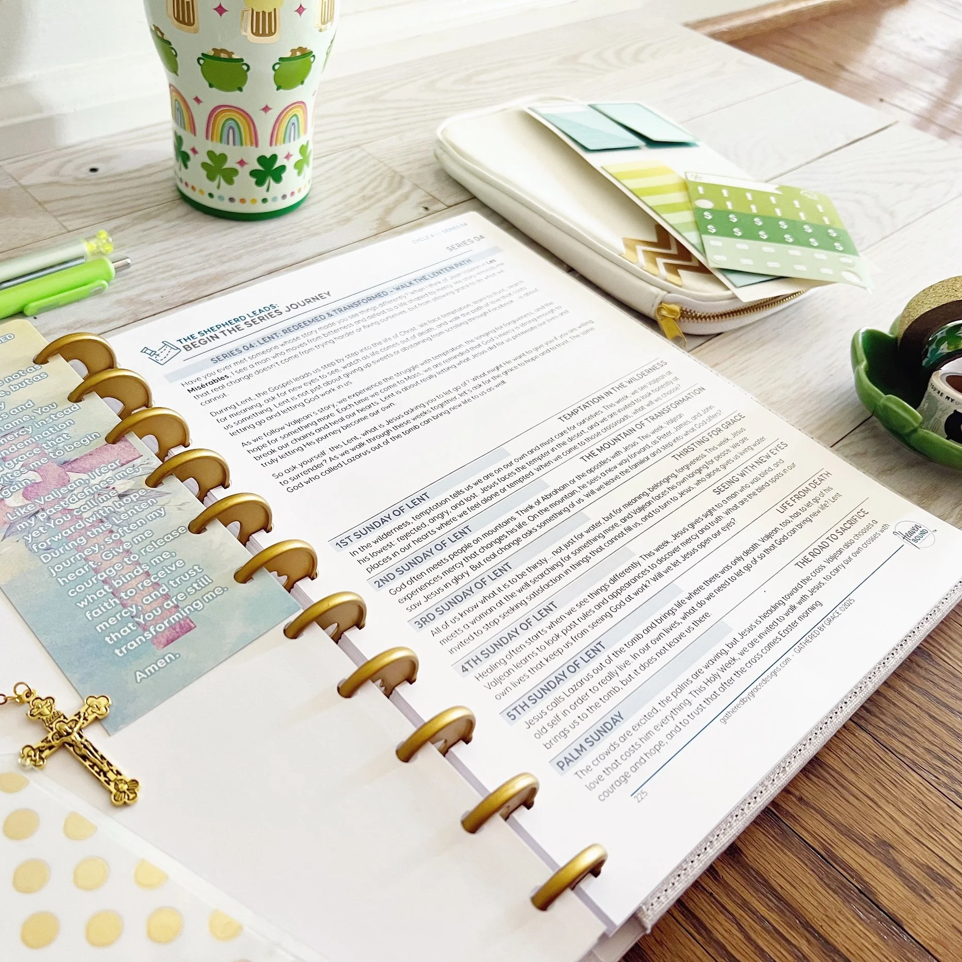 This welcome kit includes your Heaven Bound planner, gold discs, verse stand, and foundational pages that help you set your Faith Focus and map the liturgical year.